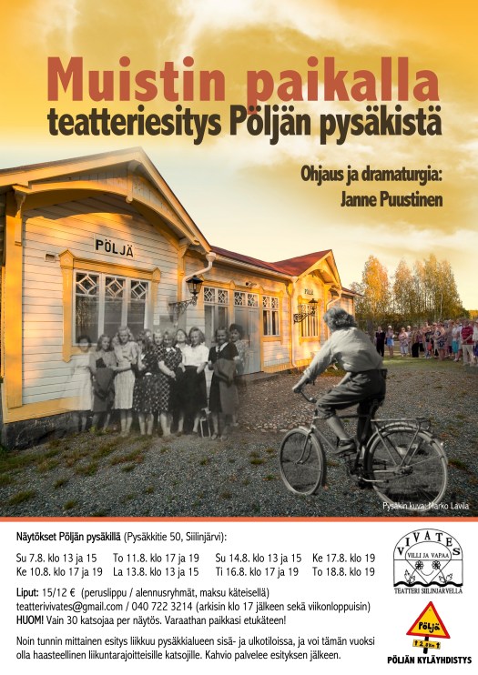 Liput: 15/12 € (peruslippu / alennusryhmät, maksu käteisellä) 040 722 3214 (arkisin klo 17 jälkeen ja viikonloppuisin) / teatterivivates@gmail.com