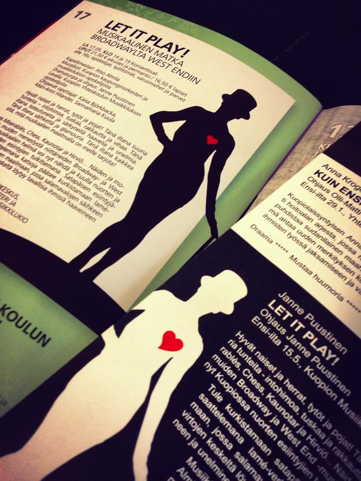 Tänään on taas jännät paikat, kun uuden proggiksen harjoituskausi pyörähtää käyntiin! Kyseessä on yhteistuotanto, jonka dramaturgina ja ohjaajana toimin. Esityksen nimi on Let It Play! – Musikaalinen matka Broadwaylta West Endiin ja sen taustalla toimivat Kuopion kaupunginteatteri, Kuopion Musiikkikeskus ja Kuopion Yhteiskoulun Musiikkilukio. Potpurimuotoinen esitys pureutuu kylmältä ja kovalta tuntuvaan musikaalibisneksen maailmaan, jonka takaa kuitenkin löytyy tavallisia ihmisiä omine haaveineen ja unelmineen.