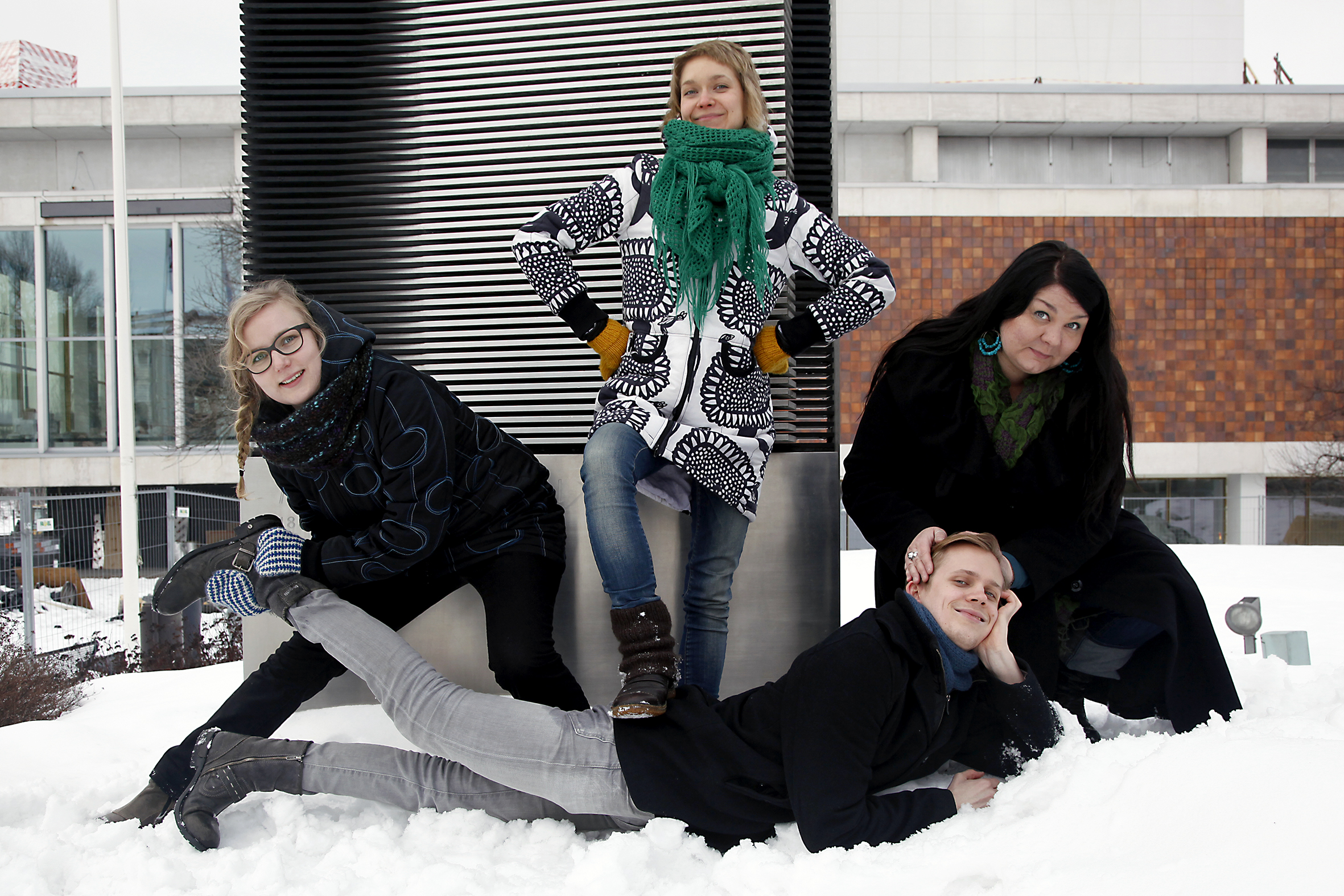 Teatteri Neljännen Soiton väki: Riikkamaria Korhonen, Anni Marin, Tiina Paakko ja Janne Puustinen. Kuva: Maija Voutilainen.