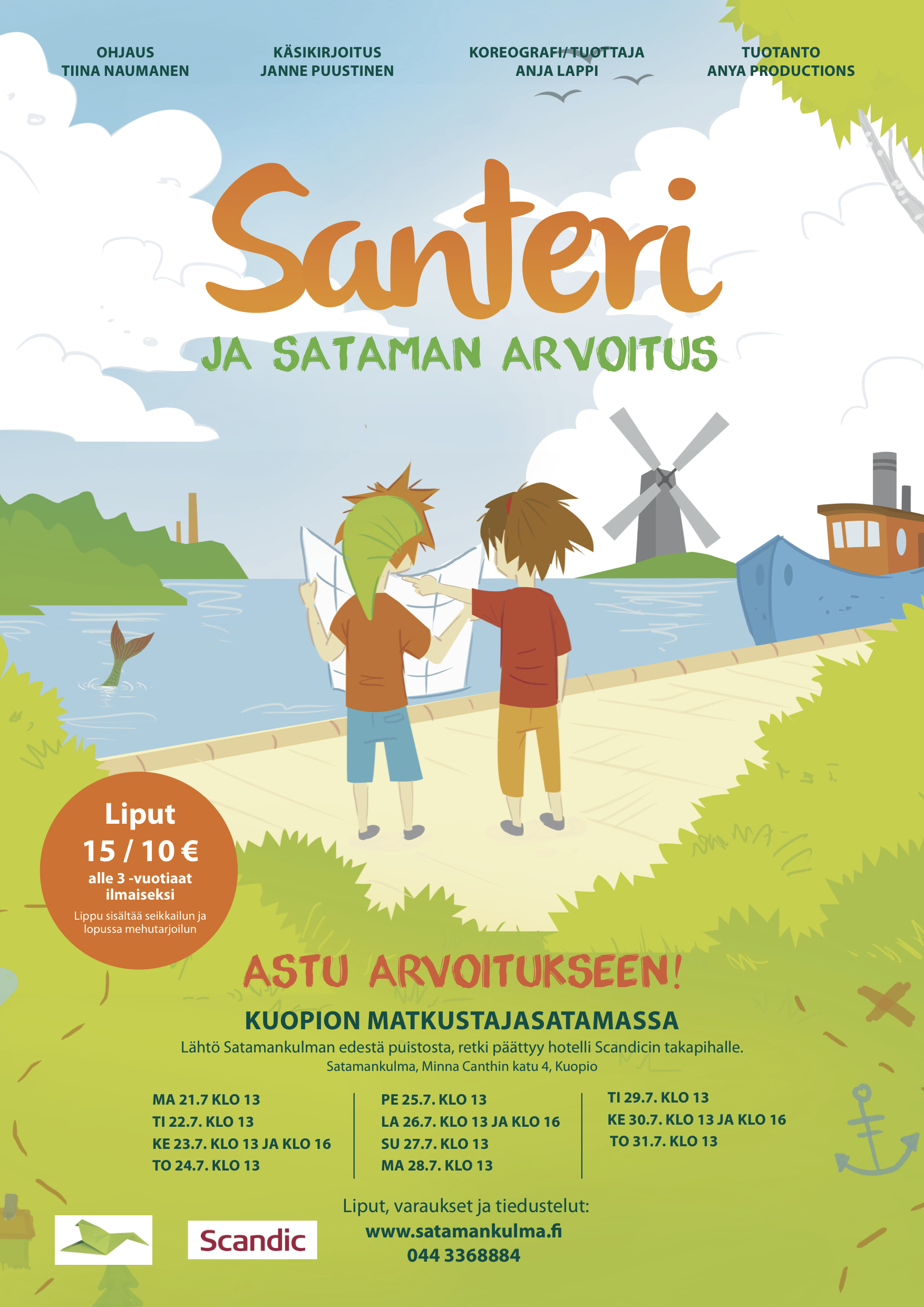 Käsikirjoittamani Santeri ja sataman arvoitus oli nähtävillä heinäkuun ajan Kuopion matkustajasatamassa. Tiina Naumasen ohjaama esitys jäi itseltäni näkemättä kokonaan – oma kesä kului interreilatessa ympäri Eurooppaa. Onneksi katsojapalaute ja lehdistön kirjoittelu on puhunut puolestaan, ja nyt voin hyvillä mielin odotella, että pääsen katsomaan esityksen taltioinnin heti sen valmistuttua.